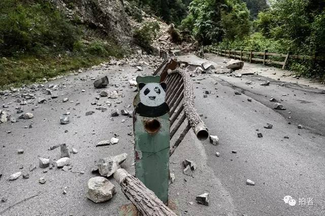 而如今,地震导致诺日朗瀑布附近一段道路坍塌,坍塌的一侧路面落入下方的海子里;在其上游一段路面,带有熊猫形象的一段栏杆被塌方落石砸毁↓