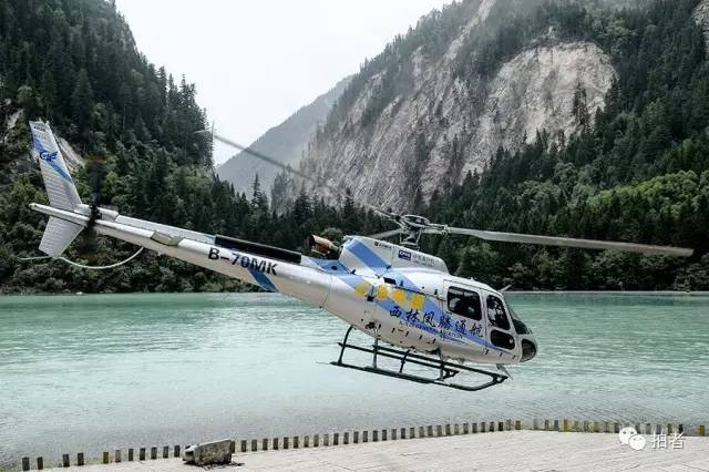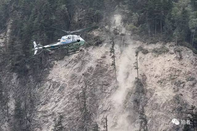 下图为一架载有两名伤员的救援直升机在熊猫海起飞,直升机飞行过程中,旁边的塌方区正在余震的作用下不断垮塌↓