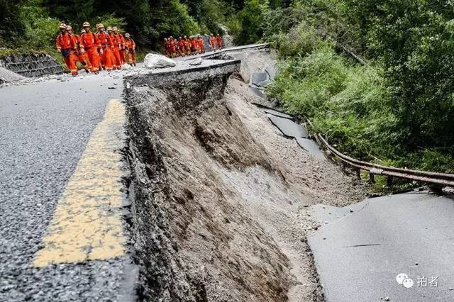 ▲ 8月10日,九寨沟景区S301省道,武警交通正在指挥单向放行,通过坍塌严重的危险路段时,很多人快速跑步前行。
