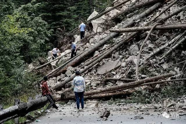 几名民警翻过诺日朗瀑布附近的塌方区,进入九寨沟景区深处↓