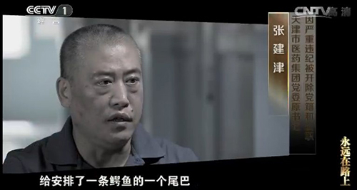 反腐专题片《永远在路上》中,天津市医药集团原党委书记、董事长张建津这么描述一次宴请餐桌上的食物:“给安排了一条鳄鱼的一个尾巴,那条尾巴应该很大,差不多得有一米,那个摆的,当时就摆的是整个带形的,也很好看,但是我觉得应该是很贵的,肯定也是预定的,反正就是显示他(私企老板)的热情……”在吃上有追求的张建津,对于喝也是毫不马虎,爱喝年份茅台、讲究越醇越好的他甚至想出了用矿泉水瓶装酒的招数,“如果人家用手机给你拍个片子,那网上不就有证据了吗,所以就把那个茅台酒就倒在矿泉水瓶里边,然后拿矿泉水瓶子在大家分酒的时候再分着倒着喝。”