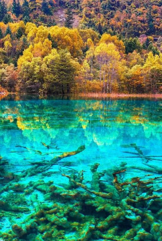 (五花海,水底树木上为钙华;另外有一个真相:一般家庭烧水壶底的水垢与钙华为同一种物质,美与丑的差别在于它所处的位置;摄影师@张坤琨)