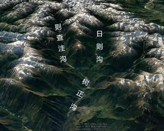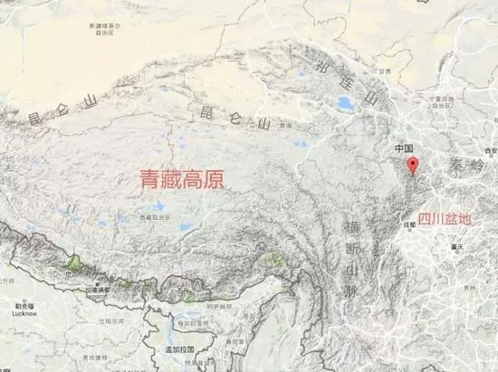 (图中红色水滴为九寨沟位置,地图源自@Google,星球研究所标注)