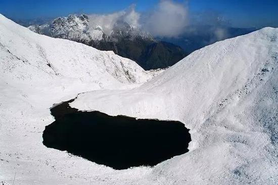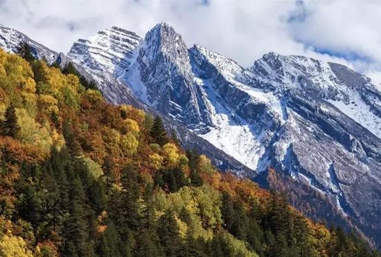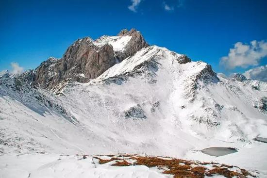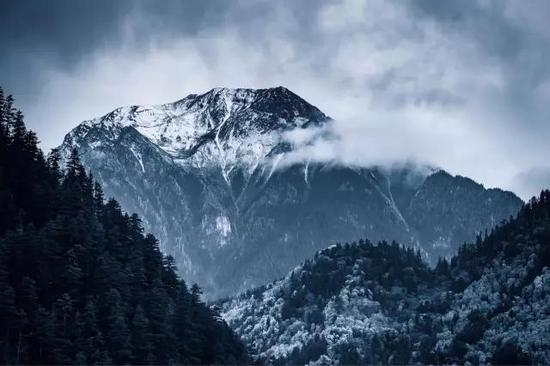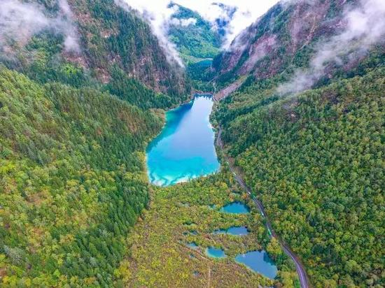 (九寨沟区域的山峰都在雪线之下,为季节性雪山;当地人认为该山为万山之祖,下方湖泊为褡连海,由多个带状小湖组成;摄影师@钱玮)