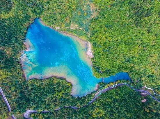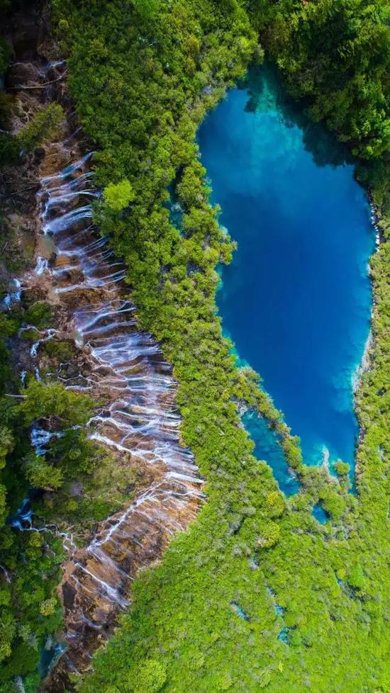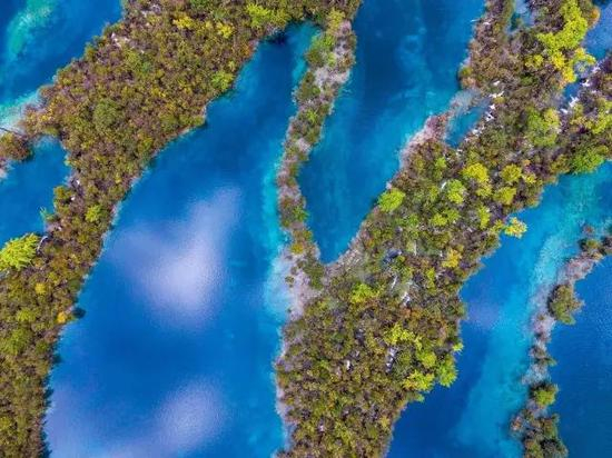 (树正群海航拍,中间的条状堤坝多由钙华沉积形成,摄影师@李珩)