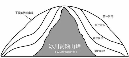 (冰川剥蚀山峰形成角峰的示意图,原图刊载于1958年《The Physical Geography of Glaciers and Glaciation》,星球研究所修订并增加中文标注)