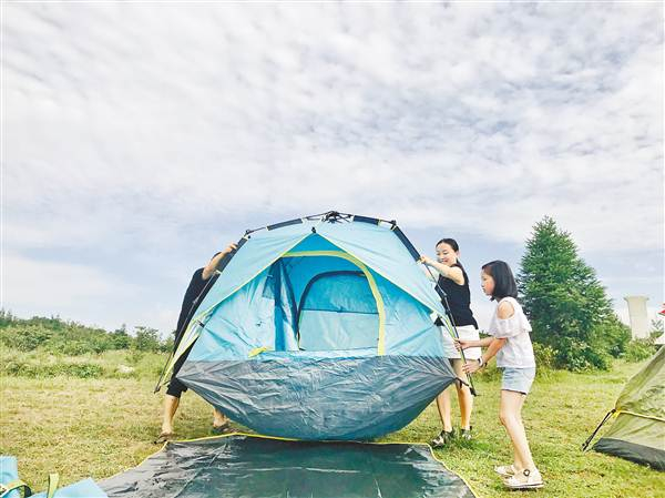 说话间,彭女士一行人便带着帐篷来到了露营点。“我上周末才跟朋友一起来过,觉得很不错,凉快、景色也漂亮。主要是娃儿很喜欢。”彭女士边支帐篷边说,“我上周来得晚,差点没租到帐篷,这次我还特意买了一顶。”