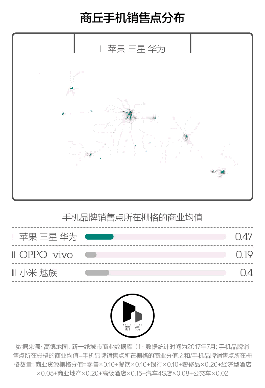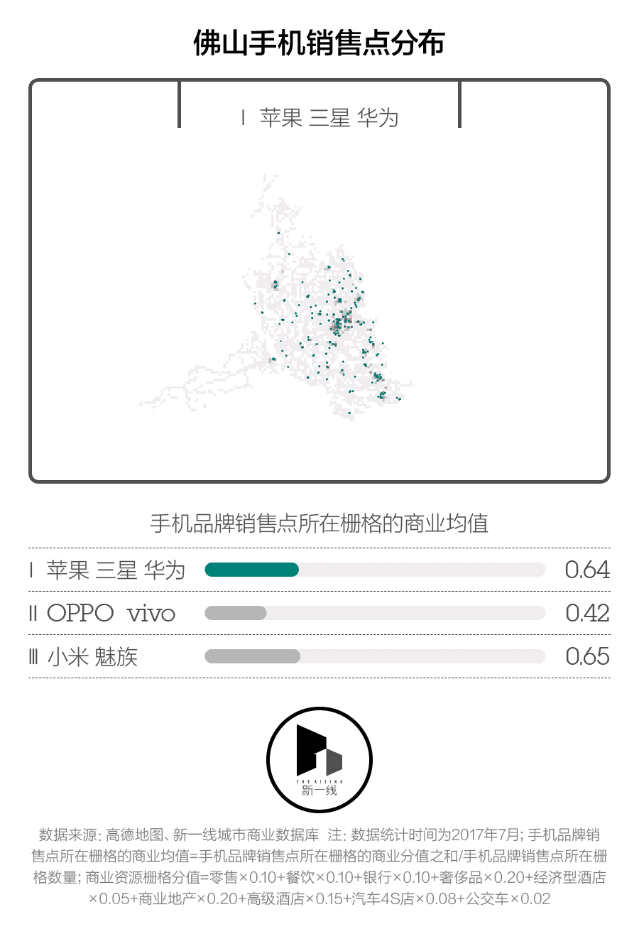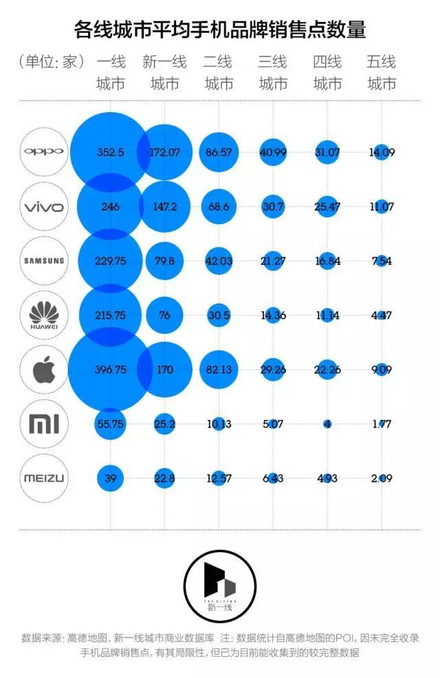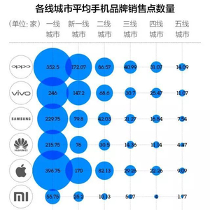 尽管新一酱暂时还没有办法拿到各手机品牌在城市的销售额数据,但你依然可以从销售点数量上大致看出问题的答案。