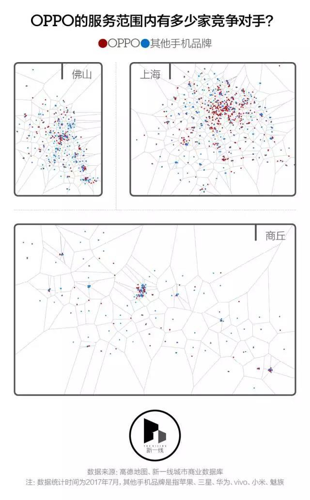 用数据的表达是:如果计算每家OPPO销售点服务范围内的竞争对手数量(即每个泰森多边形内其他点的数量),上海的平均值是3.59,佛山是2.38,而商丘的这个数值只有0.49。
