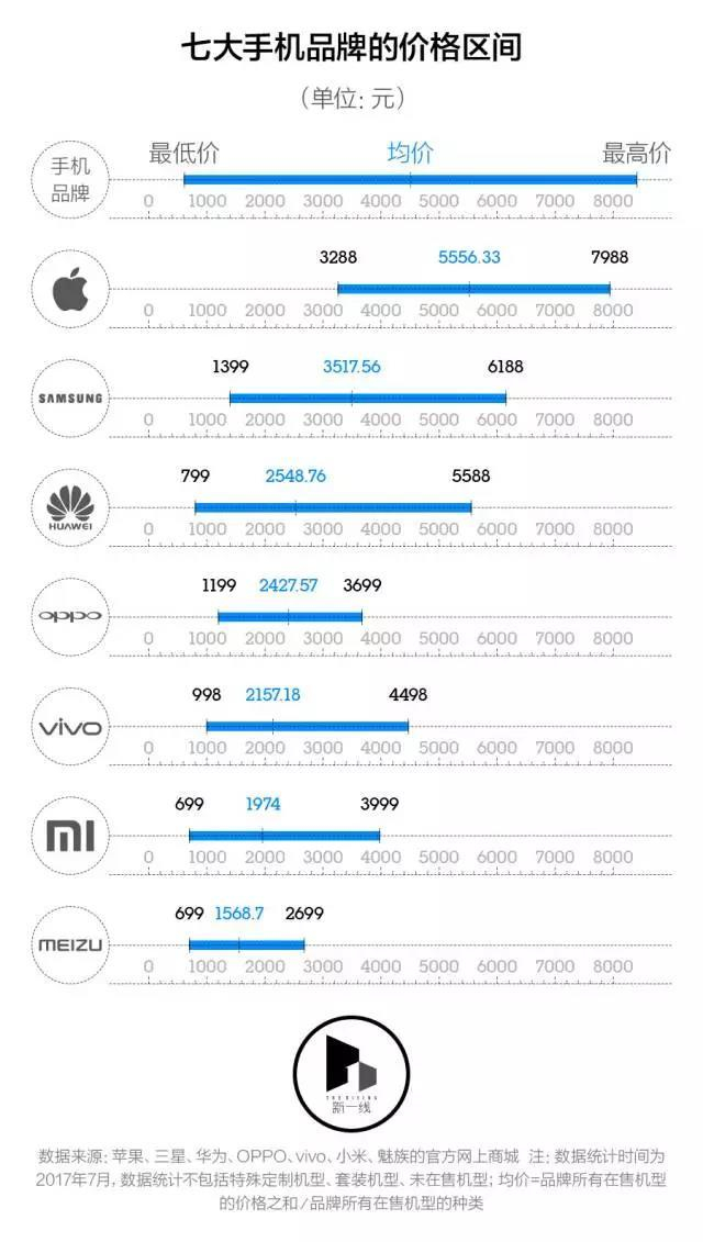 销售点分布差异的背后,其实与每个品牌的价格定位有关。新一酱又统计了7个手机品牌的在售机型价格区间和均价。