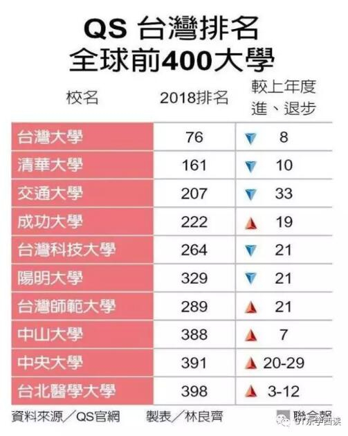 在英国高等教育调查公司(QS)今年6月公布的2018世界最佳大学排行榜中,台湾10所高校进前400,其中台湾大学排名最高,为76名,清华大学排名161,交通大学排名207。