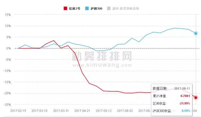 此外红林2号又是一路下跌,在5月12日的净值下降到0.8097元,在6月2日净值更是下降到0.8007元,离清盘线一步之遥,此后红林2号私募基金便一直处于清盘线附近徘徊,在6月、7月的反弹中净值有所回升,在7月21日净值达到0.8213元,不过到了8月4日的净值为0.8018元,红林2号私募基金再次回到清盘线附近。