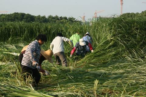 徐行黄草是当地河滩边常见的野生草本植物,每年7、8月是收割时节。黄草高大挺拔,高约有2米,直径约1厘米,收割时只能徒手拔取。采收者先拉开下长叶,然后将白白嫩嫩的茎秆向上逐株拔出。