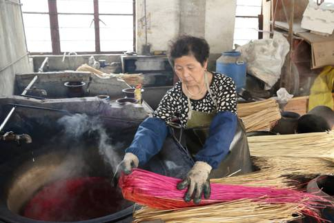 染色能提高黄草织品的观赏性。染色时,非常讲究火候温度和颜料配比。一人烧锅一人染,待锅中水烧开后,往锅中添加颜料并调匀,随后将黄草投入,约一分钟后染色便成功。黄草染色通常有红、黄、棕等7种颜料,最手巧的农民能配出20多种颜色。