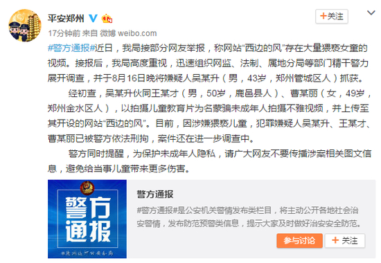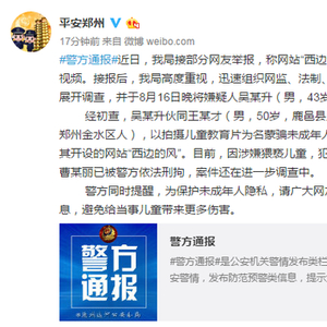 #警方通报#近日,我局接部分网友举报,称网站“西边的风”存在大量猥亵女童的视频。接报后,我局高度重视,迅速组织网监、法制、属地分局等部门精干警力展开调查,并于8月16日晚将嫌疑人吴某升(男,43岁,郑州管城区人)抓获。