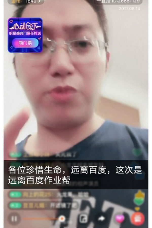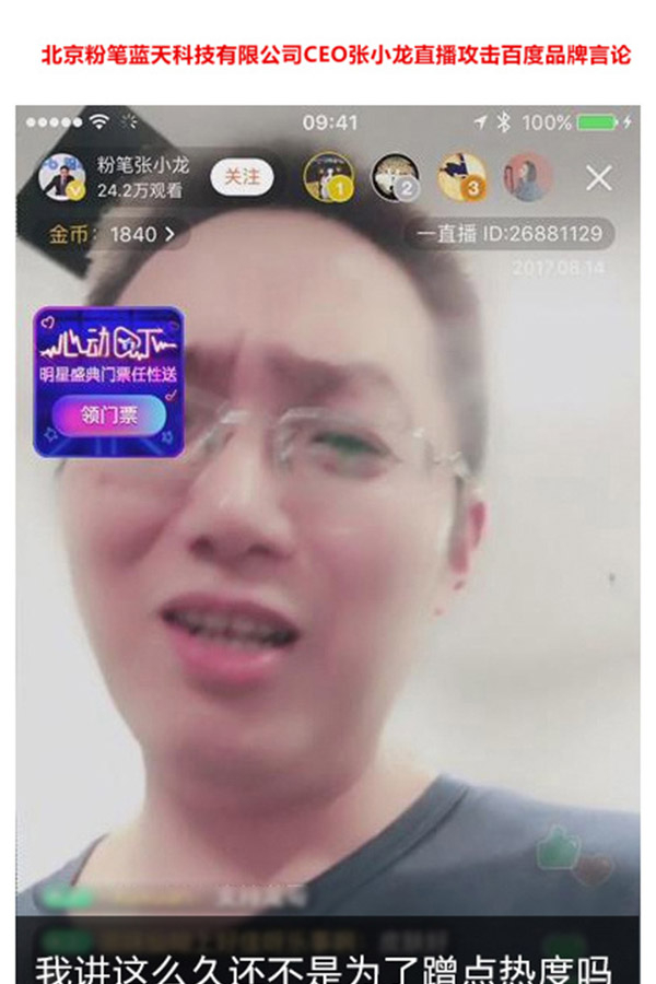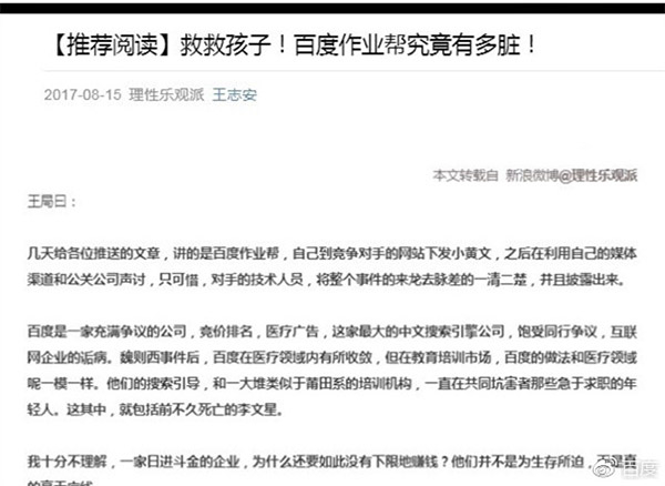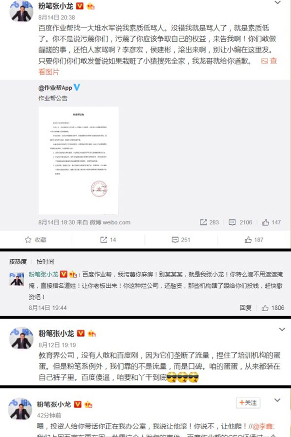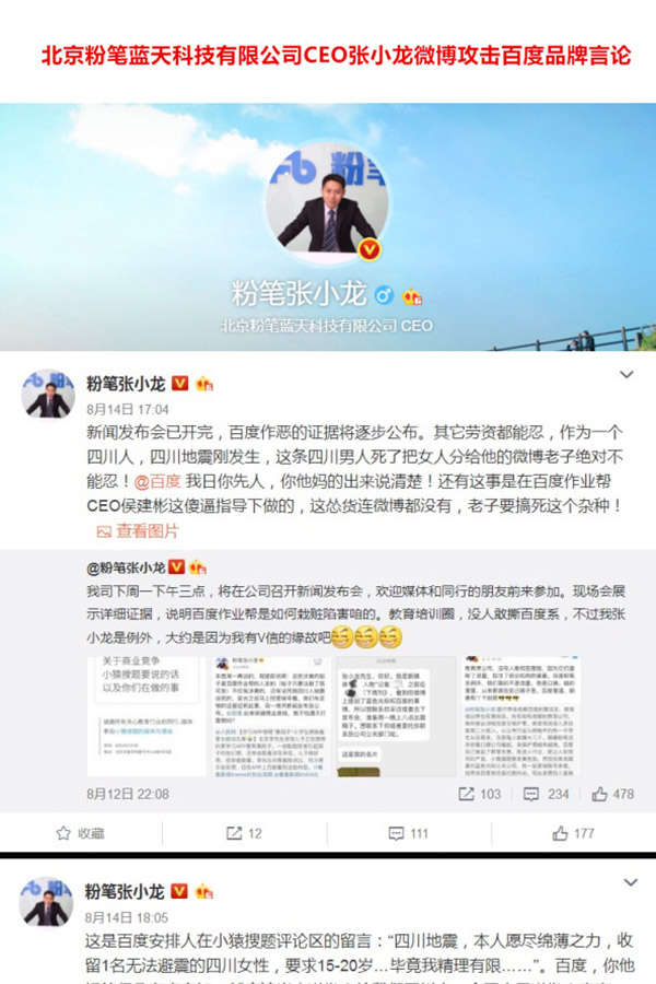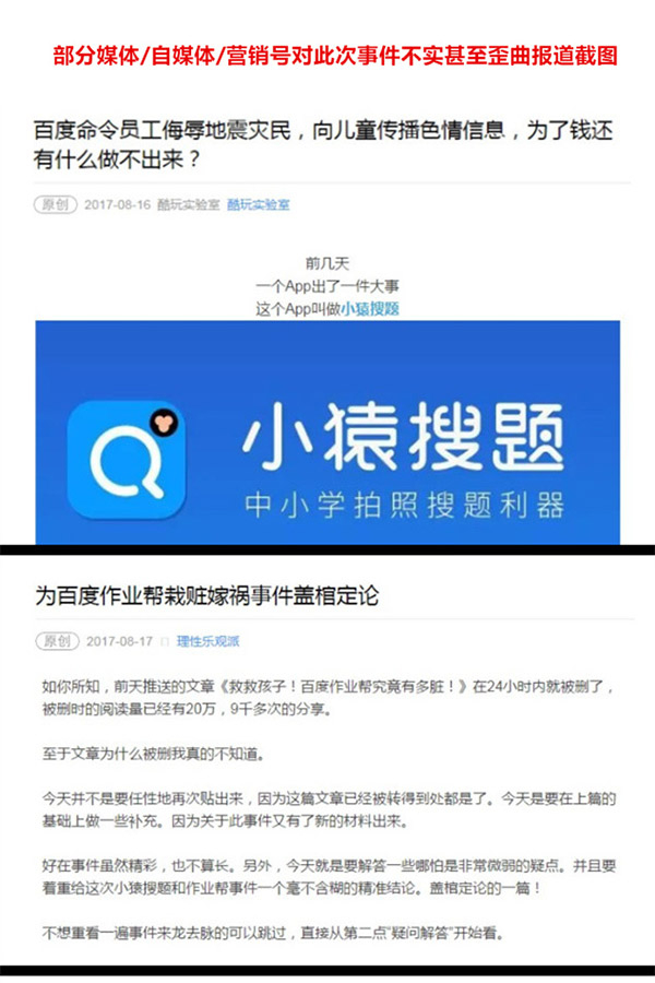 2、作为投资方,百度从未以任何形式参与此次小猿搜题与作业帮的争端,从未有小猿搜题方面大肆宣扬的所谓“百度命令员工侮辱地震灾民,向儿童传播色情信息”的行为。然而,小猿搜题为达到引发关注、扩大影响的目的,在其新闻发布会演示材料、散发给媒体的素材、自行写作或运作的公关稿件,营销大号及关联公司北京粉笔蓝天科技有限公司CEO张小龙的个人微博、直播内容中,蓄意绑架“百度”品牌,肆意攻击诬陷,经协商警示后仍不停止此类侵权行为,给百度公司品牌及商誉造成显著伤害。为维护自身合法权益,百度已搜集相关证据,向法院起诉小猿搜题运营主体、关联公司粉笔蓝天CEO张小龙等不法行为人,以及其他参与其中的营销大号及相关平台。