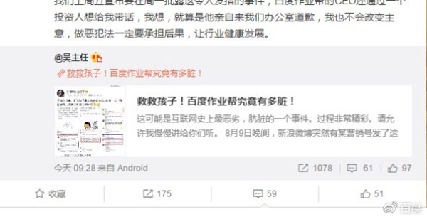 3、在得知此次纠纷后,百度已以投资方身份,要求作业帮就相关情况进行调查及说明,建议他们如自身确有媒体报道的不法行为,应坚决自查自纠并严肃处理。而同时,如遇竞争对手恶意侵害,则需动用法律手段给予坚决反击。在通过第三方厘清事件真相之前,百度对此次行业恶斗不持支持某方的倾向性立场。