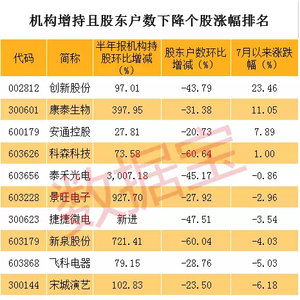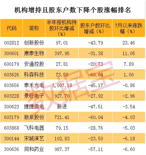 11股二季度机构增持且股东户数下降超20%