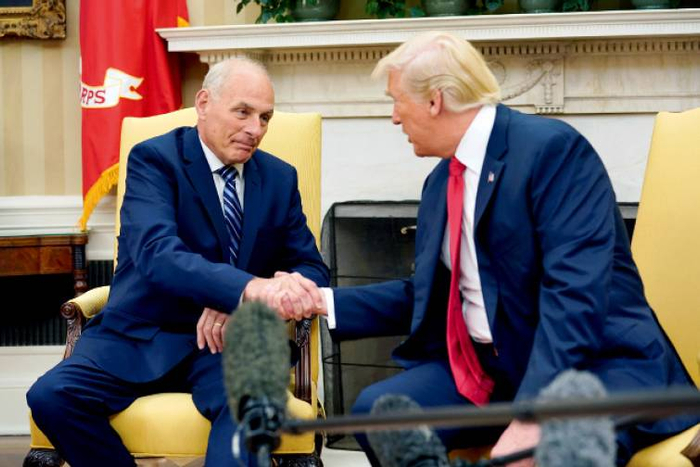 7月31日,在美国华盛顿,美国退役将领、前国土安全部部长约翰·凯利宣誓就任白宫办公厅主任。美国总统特朗普(右)在宣誓仪式后与约翰·凯利握手。图/新华