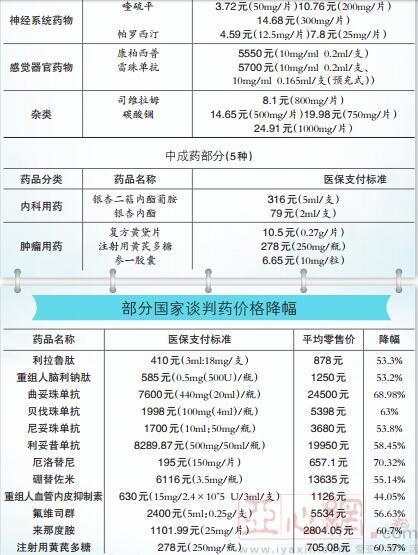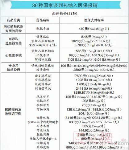 在这些药品中,有15种西药和3种中成药是肿瘤治疗药品,覆盖了肺癌、胃癌、乳腺癌、结直肠癌、淋巴瘤、骨髓瘤等癌种,包括曲妥珠单抗、利妥昔单抗、硼替佐米等多个患者需求迫切的治疗药;其他为治疗心血管病、血友病、糖尿病、肾病、精神病等重大疾病或慢性病的药品。
