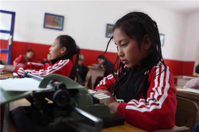 德庆玉珍在拉萨盲校使用打字机(2008年摄,资料照片)。新华社发