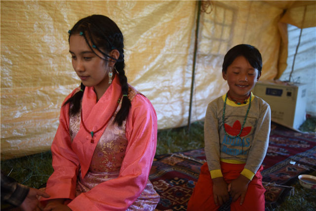 8月13日,德庆玉珍(左)和弟弟在自家帐篷内聊天。新华社记者 黄晓勇 摄