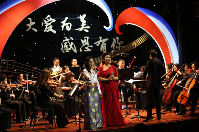 6月26日晚,上海音乐学院为德庆玉珍举办“大爱为美 感恩有你”学习汇报音乐会。在上海贺绿汀音乐厅的舞台上,德庆玉珍(前左)与老师于丽红共同歌唱。 新华社发(张凤涛摄)