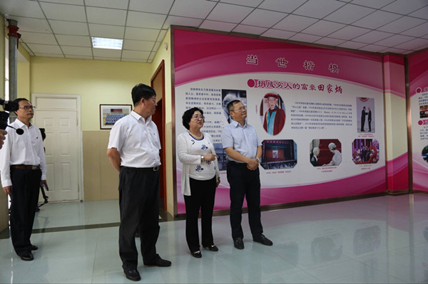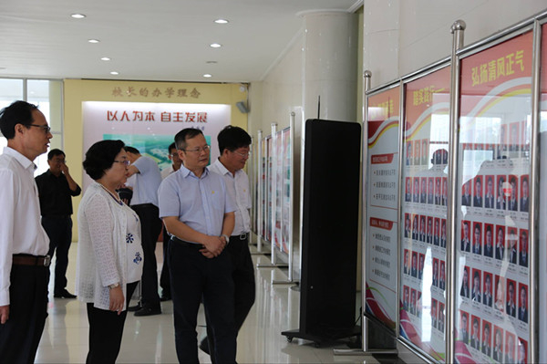 梁国超一行实地观看了劳模工作室、名师名校长工作室、心理健康教育中心、党建工作展板,翻阅了党员政治理论学习笔记。在踏查党建活动阵地“党员之家”时,他对党员教师手抄《“两学一做”学习教育应知必会知识》这一做法表示赞赏,对学校开展“两学一做”常态化制度化的创新举措给予肯定。
