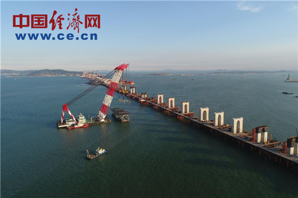 我国首座公铁两用海峡大桥架设首片钢桁梁
