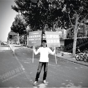 7月底,《中国经济周刊》记者顶着烈日来到合肥,在地铁1号线包公园站踏上了去往滨湖的列车,半个小时左右,在滨湖会展中心站下车。刚出地铁站台,一股热浪扑面而来,记者一眼瞥见马路对面一个穿着绿色T恤的男孩,手里举着两块红色大牌子,上面分别写着“合肥买房、首选滨湖”“滨湖新地城、红星美凯龙旁”。记者举起相机想拍照,男孩却将展示牌收了起来,不让拍。男孩说,他只是开发商雇来拉客的,要是记者同意跟他去售楼处登记看房子,他就可以得50元,这样他才会同意拍照。记者应允。