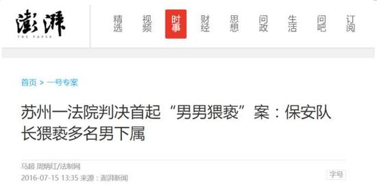 这一修改也很快令遭到猥亵侵害的男性受害者有了维权的依据。去年7月,苏州市就判决了全国首个“男男猥亵案”:当地一名保安队长以喝酒聊天为由,把多名年轻的保安队员灌醉后强制猥亵,最终被当地法院判处了2年9个月的刑期。