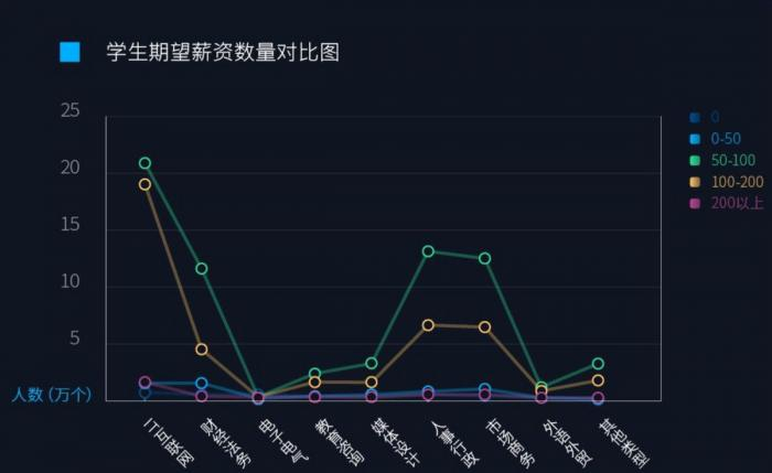 实习生们对于IT互联网岗位的薪资期待高于其他各个行业。在实习僧统计的130万数据样本中,超过40万的学生期待在IT互联网行业拿到50-200元/天的薪资,与之形成鲜明对比的是电子电气行业,期望拿到薪资的实习生不足5万人。