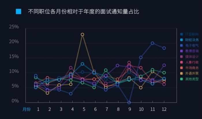 虽然在各个职位挑出了一些简历阅览的高峰月份,但是整体来看,热门的IT互联网、财政法务、人事行政和市场商务类岗位的全年面试分布较为均衡,也就是说无论你是什么时候投,一旦进了面试竞争压力也是不小的。