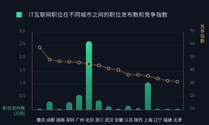 以最热门的IT互联网类职位为例,竞争最激烈的城市是重庆、成都和湖南,发布该类别职位最多的北京才排名第六位,上海仅排在十二位。