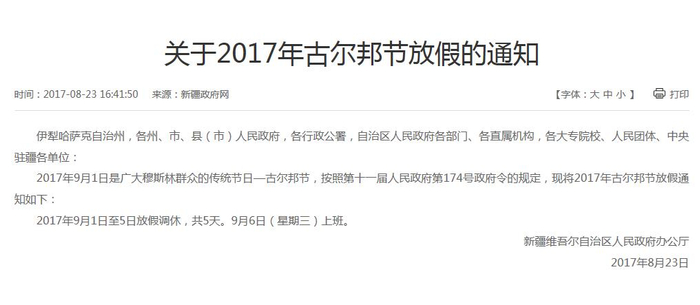 2017年古尔邦节新疆9月1日至5日放假5天 天山网 2017.08.2316:54 关注 天山网讯(记者翟文杰报道)记者从新疆维吾尔自治区人民政府网获悉,2017年9月1日是广大穆斯林群众的传统节日—古尔邦节,9月1日至5日放假调休,共5天。9月6日(星期三)上班。