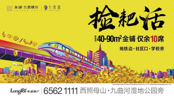 现龙湖九里滙烫金商铺正在火热销售中,建面约40㎡—90㎡商铺仅剩10套。地铁边、社区口、学校旁,三位一体黄金旺铺,占据西照母山未来大城核心地段,将城市财富一网打尽!详情请咨询:02365621111。