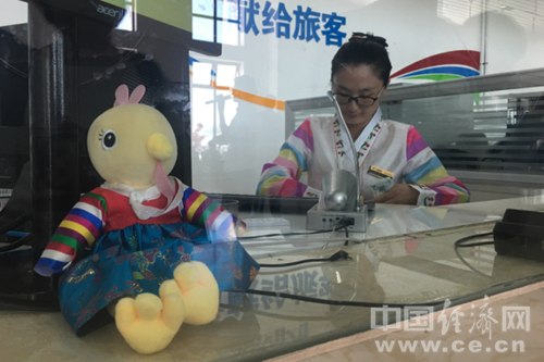 身着朝鲜族传统服装的工作人员正在售票窗口中工作。经济日报-中国经济网记者刘潇潇/摄