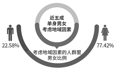 珍爱网调研发现,有近五成的单身男女在择偶时会考虑地域因素。其中,77.42%的女性在择偶时会看“产地”,远高于男性,可见女性在婚恋择偶中会更重视地域因素。