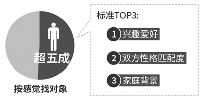 调查中还发现,男女的择偶标准也呈现出明显的差异。八成的女性表示自己会按照严格的择偶标准来找对象,择偶时会优先考虑对方的工作收入、家庭背景及双方性格匹配度;而超五成的男性表示自己在择偶时更看重感觉,优先考虑对方的兴趣爱好、双方性格匹配度及家庭背景。