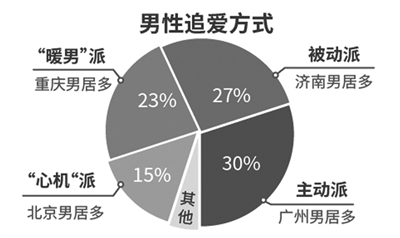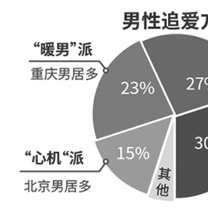 此次报告中一个有趣的现象是,23%的男性在追爱时喜欢对女方的生活嘘寒问暖,甚至随叫随到,属“暖男”派,而这其中以重庆男居多。重庆电视台婚恋相亲节目《凡人有喜》栏目组表示:“在我们录制节目时,那些穿着整洁,贴心买水,照顾每个人情绪的男嘉宾确实会给人好印象。”