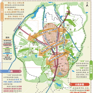 “环网多廊”中,“环网”为沿城市快速路形成的环形道路绿带;“多廊”为沿其他干道、铁路等形成的绿色廊道,连接各处绿地,并与周边环境相融合。