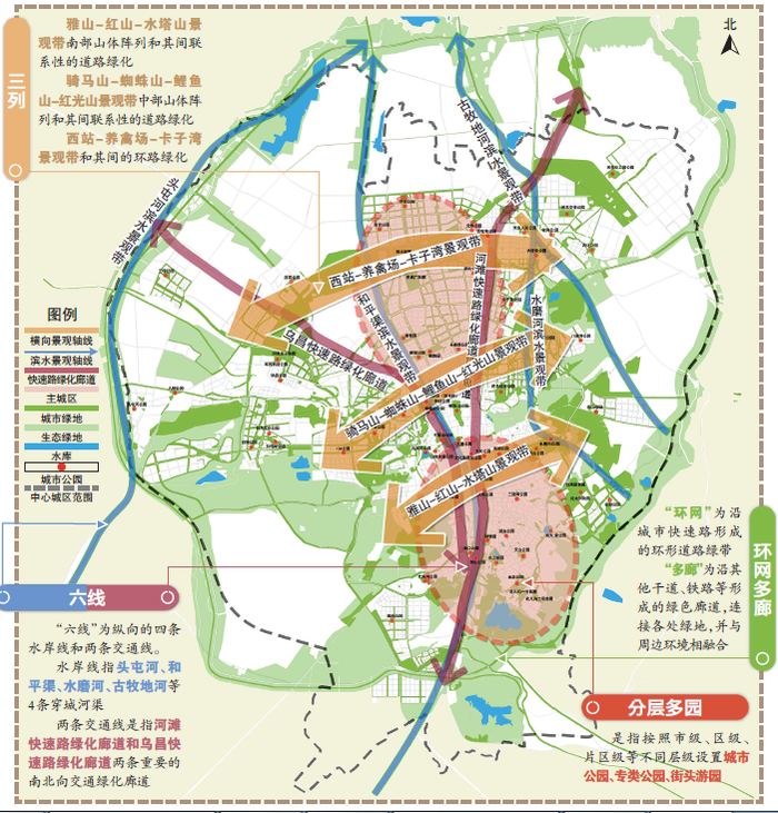 乌鲁木齐将以“三列六线、环网多廊、分层多园”为基本格局,在中心城区形成“点线面相结合的环网式”绿地系统,进一步提升人们在城中游憩的休闲环境。
