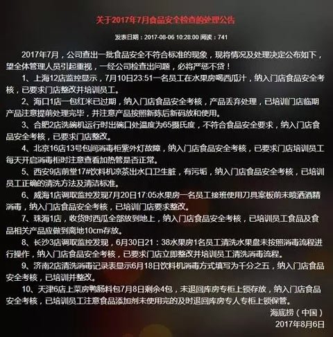 这样看来,海底捞食品安全不止是此次被曝光的这么简单。值得注意的是,在海底捞官方通报中只强调培训并整改,但并未对涉事员工进行处罚。翻看前几年的通报也一样。