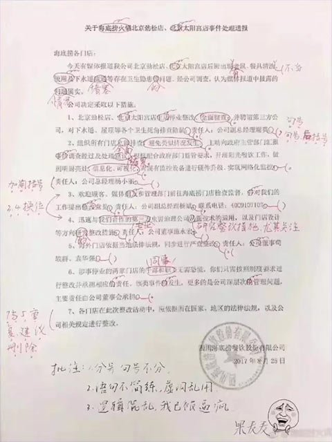 还有人直接指出海底捞的那篇通报声明是漏洞百出,直接对其发了校对版,称其“标点错误百出,语句不简练虚词乱用,逻辑混乱”。