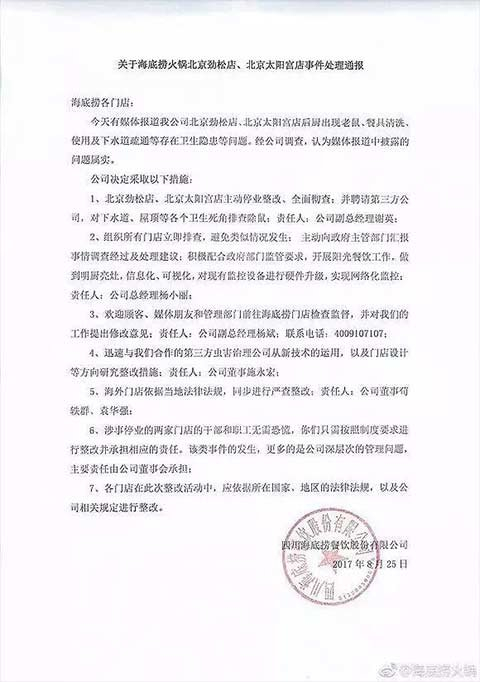 随后2个小时,海底捞又发布了一份涉事门店的处理通报,涉及更具体的7条措施,包括暂时关停两家涉事门店、研究整改措施,安抚员工并承认更多是公司深层次管理问题,并声明主要责任由公司董事会承担。