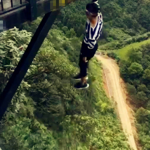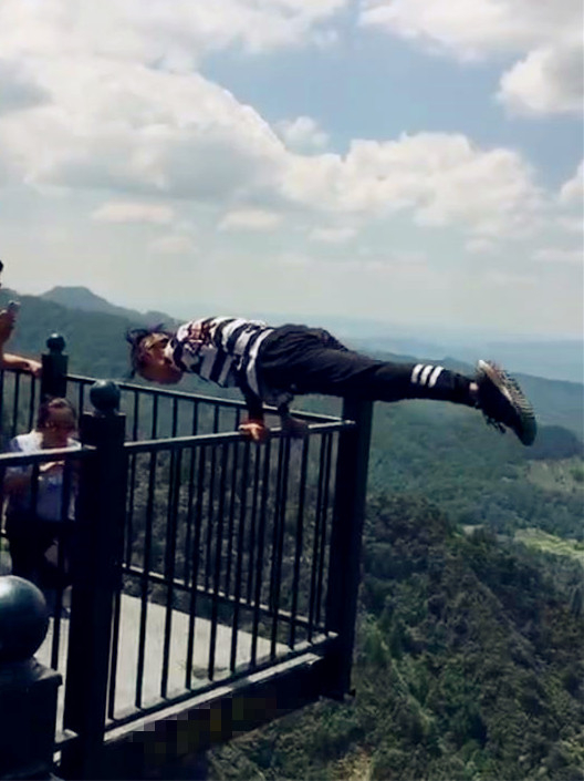 目测一个二十出头的小伙,在悬空千米的天悬廊桥外围处炫技。他时而做仰卧起坐,时而做引体向上,时而做俯卧撑。