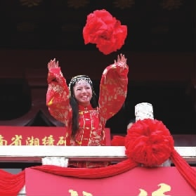 身着盛装的“汉代小姐”举行热闹的抛绣球仪式。记者 田超 摄