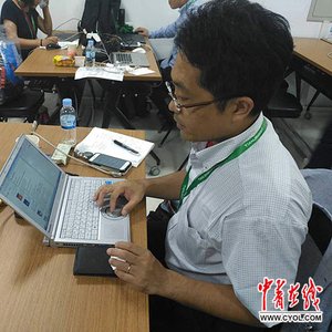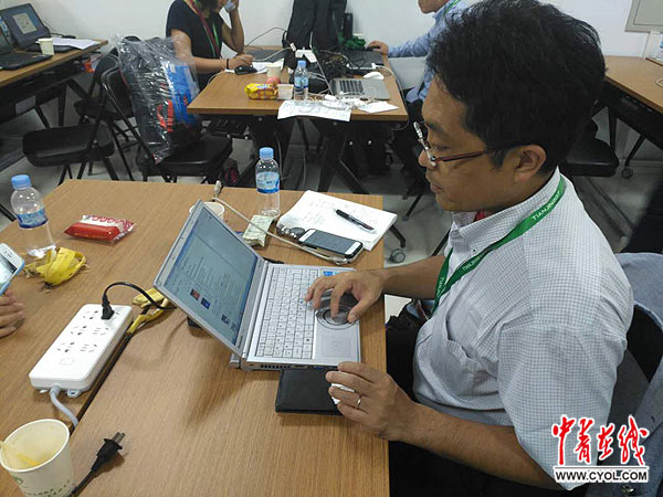 日本共同社记者田村崇仁正在写稿。