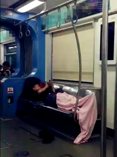 男子自带被子坐轻轨 车厢座椅秒变舒适大床