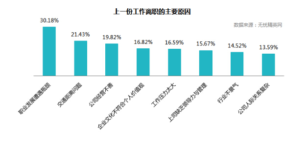 除了对薪酬福利的考量,调研数据显示“个人职业发展遭遇瓶颈”、“交通问题”是离职的两大主因。多数企业尤其是民营企业,受限于管理理念和业务发展,往往无法帮助员工进行长远有效的职业发展规划。很多优秀的员工在职位上得不到提升,在技术上无法提高,逐渐因倦怠与失望而离职。